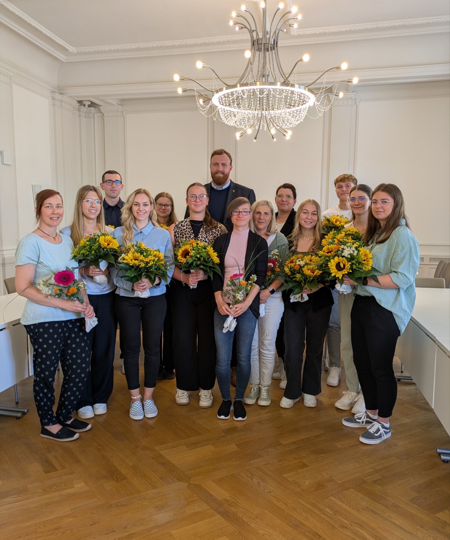 Foto: Oberbürgermeister Martin Papke und Ausbildungsleiterin Linda Eckey (hinten Mitte) hießen die neuen Auszubildenden Celina Kretzschmar, Laura Fischer, Ben Häcker und Mia Goßler (v.r.n.l.) willkommen und gratulierten den ehemaligen Auszubildenden Lena-Marie Scheffs, Dustin Hudl, Patrizia Schulz, Laura Werner und Leoni Chantal Bauer (ab 2. Person v.l.n.r.) zur bestandenen Prüfung.