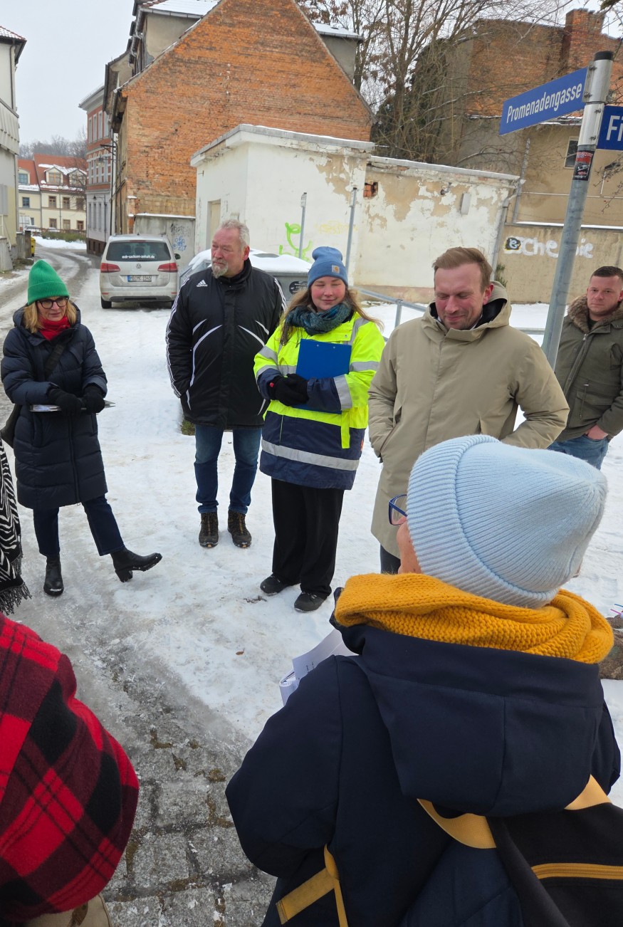 Foto: Im Rahmen eines Pressegespräches stellte Herrmann Schröder vom Architekturbüro SCHRÖDER HOLDING GmbH aus Weimar (2.v.l.) das Bauvorhaben für den Neubau eines Büro- und Geschäftshauses in der Weißenfelser Innenstadt vor. Lisa Nydahl vom Landesamt für Denkmalpflege und Archäologie Sachsen-Anhalt (3.v.l.) berichtete von anstehenden archäologischen Untersuchungen, die baubegleitend auf dem Areal zwischen Promenade und Fischgasse stattfinden werden. (Bildquelle: Katharina Vokoun/ Stadt Weißenfels)