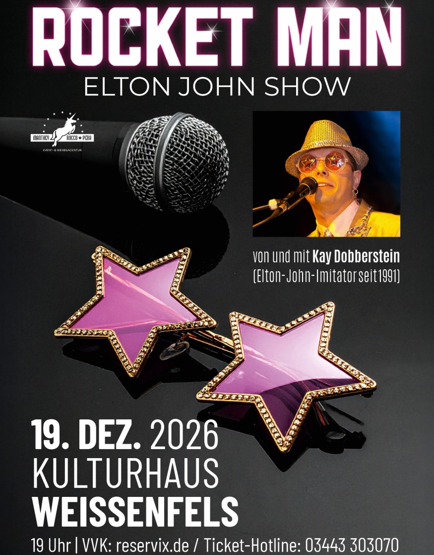 Veranstaltungsort: Weißenfels19.12.2026 19:00 Uhr (Einlass 18:00 Uhr) A TRIBUTE TO ROCKET MAN - Die Elton-John-ShowTickets: https://www.reservix.de/tickets-a-tribute-to-rocket-man-die-elton-john-show-in-weissenfels-kulturhaus-weissenfels-am-19-12-2026/e2504516