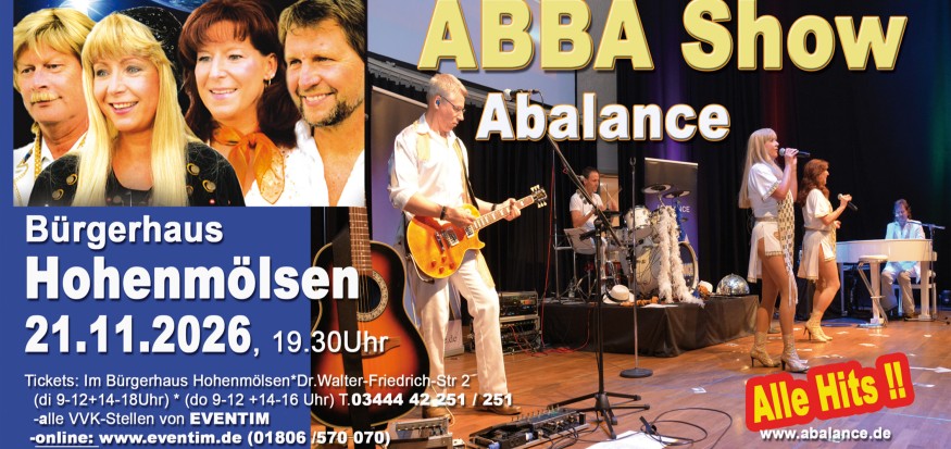 Hohenmölsen – Am Samstag, 21. November 2026 gastiert die ABBA-Tribute-Show ABAlANCE im Bürgerhaus Hohenmölsen (Dr.-Walter-Friedrich-Straße 2). Das Publikum erwartet ein Abend mit den bekanntesten ABBA-Hits – zum Mitsingen, Tanzen und Erinnern.