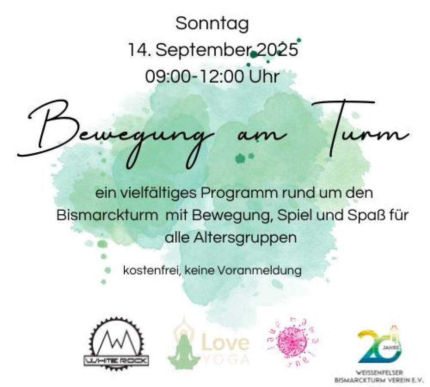 Am Sonntag, den 14. September 2025, lädt der Bismarckturmverein von 9:00 bis 12:00 Uhr zum Bewegungsfest „Bewegung am Turm“ ein. Auf dem Gelände rund um den Bismarckturm erwartet die Besucherinnen und Besucher ein vielfältiges Programm voller Spiel, Sport und gemeinsamer Aktivitäten – ganz nach dem Motto: Gemeinsam aktiv sein und den Spätsommer genießen.