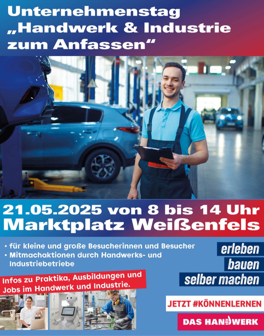 Der Weißenfelser Marktplatz verwandelt sich am 21. Mai 2025 von 8 bis 14 Uhr in eine lebendige Bühne für das regionale Handwerk und die Industrie. Beim Unternehmenstag „Handwerk & Industrie zum Anfassen“ treffen junge Menschen auf potenzielle Arbeitgeber, Familien entdecken die wirtschaftliche Vielfalt der Region – und Mitmachaktionen bringen spannende Berufe hautnah erlebbar auf den Platz. Zwanzig lokale Unternehmen und die Handwerkskammer sowie die Industrie- und Handelskammer präsentieren sich und ihre Mitmachaktionen auf dem Marktplatz.