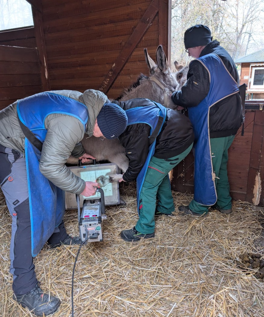 Foto: Das Röntgen des erkrankten Hufes ist für Eselin Lilly schmerzfrei. Dank des mobilen Röntgengeräts kann der Verlauf der Hufrehe in dem betroffenen Fuß genauestens verfolgt werden.