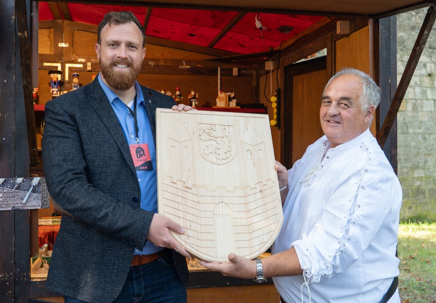 Foto: Oberbürgermeister Martin Papke erhielt von Alfred Schmidt ein hölzernes Stadtwappen für das neue Rednerpult. Der Holzbildhauer zeigte sich damit für langjährig gute Zusammenarbeit bei verschiedenen Weißenfelser Märkten erkenntlich.