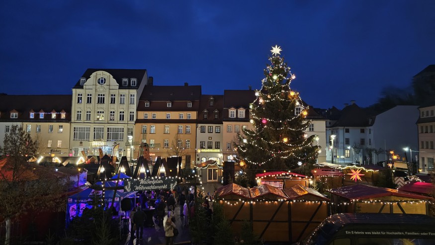Der Weißenfelser Weihnachtsmarkt lockte vom 27. November bis zum 20. Dezember 2025 mit allerlei Fahrgeschäften und Leckereien auf den bezaubernd geschmückten Platz vor dem Rathaus. Vom Kinderkarussell bis hin zu Ständen mit Bratwurst und Punsch – für alle großen und kleinen Gäste war ein Highlight dabei. Über allem thronte der eindrucksvoll geschmückte Weihnachtsbaum – eine 30 Jahre alte Rotfichte mit etwa 18 Metern Höhe und einem Gewicht von 2,4 Tonnen. An ihr erleuchteten dank eines Patenkonzepts des Stadtmarketingvereins jeden Abend 28 Herrnhuter Sterne im Takt eines Weihnachtsliedes.In den liebevoll weihnachtlich dekorierten Hütten rund um den Baum boten 40 Händlerinnen und Händler regionale Handwerkskunst, Weihnachtsgebäck und festliche Weihnachtsbeleuchtung an.