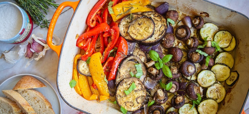 marinierte Gemüse entweder anordnen oder ganz bunt auf dem Backblech