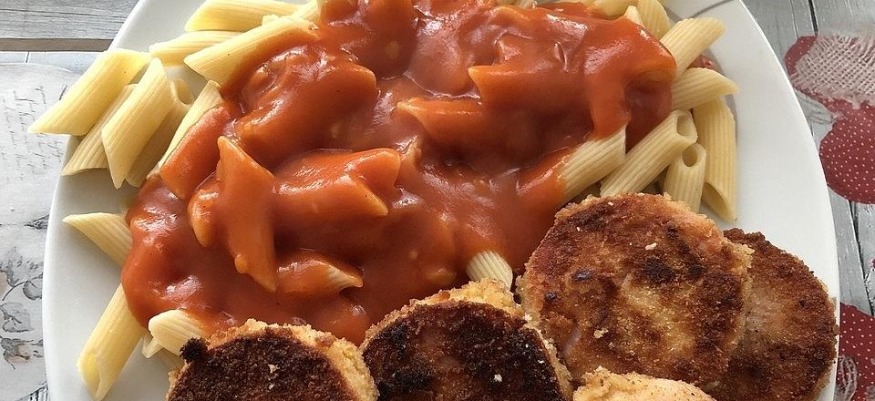 Jägerschnitzel mit Nudeln und Tomatensoße