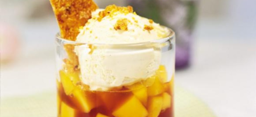 Karamellisierte Mango und Ananas mit Kokossplitter und Vanilleeis