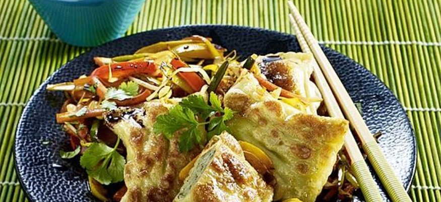 2. 3 EL Öl in einer großen beschichteten Pfanne oder einem Wok erhitzen. Gemüsestreifen